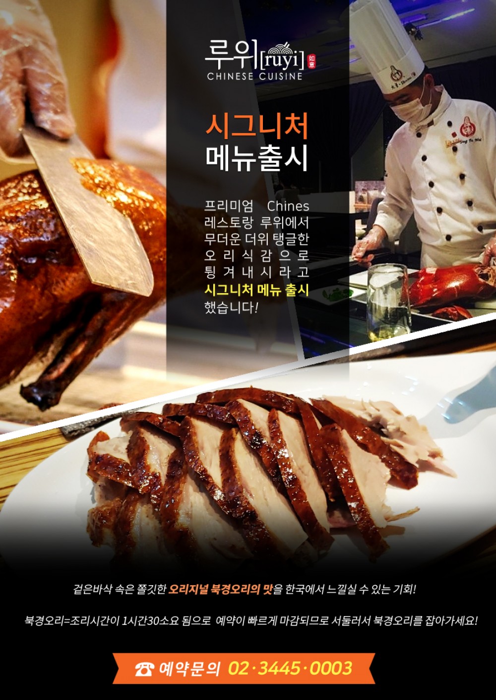 루위 시그니처 메뉴인 '북경오리 한 마리!' 79,000원에 만나실 수 있습니다.지금 바로 예약 전화 주세요 ^^(루위 입실 후 바로 드시기를 원하시면 '입실 전 1시간 30분 정도' 미리 주문을 해주시면 '입실 후 바로 맛있는 북경오리 한…
