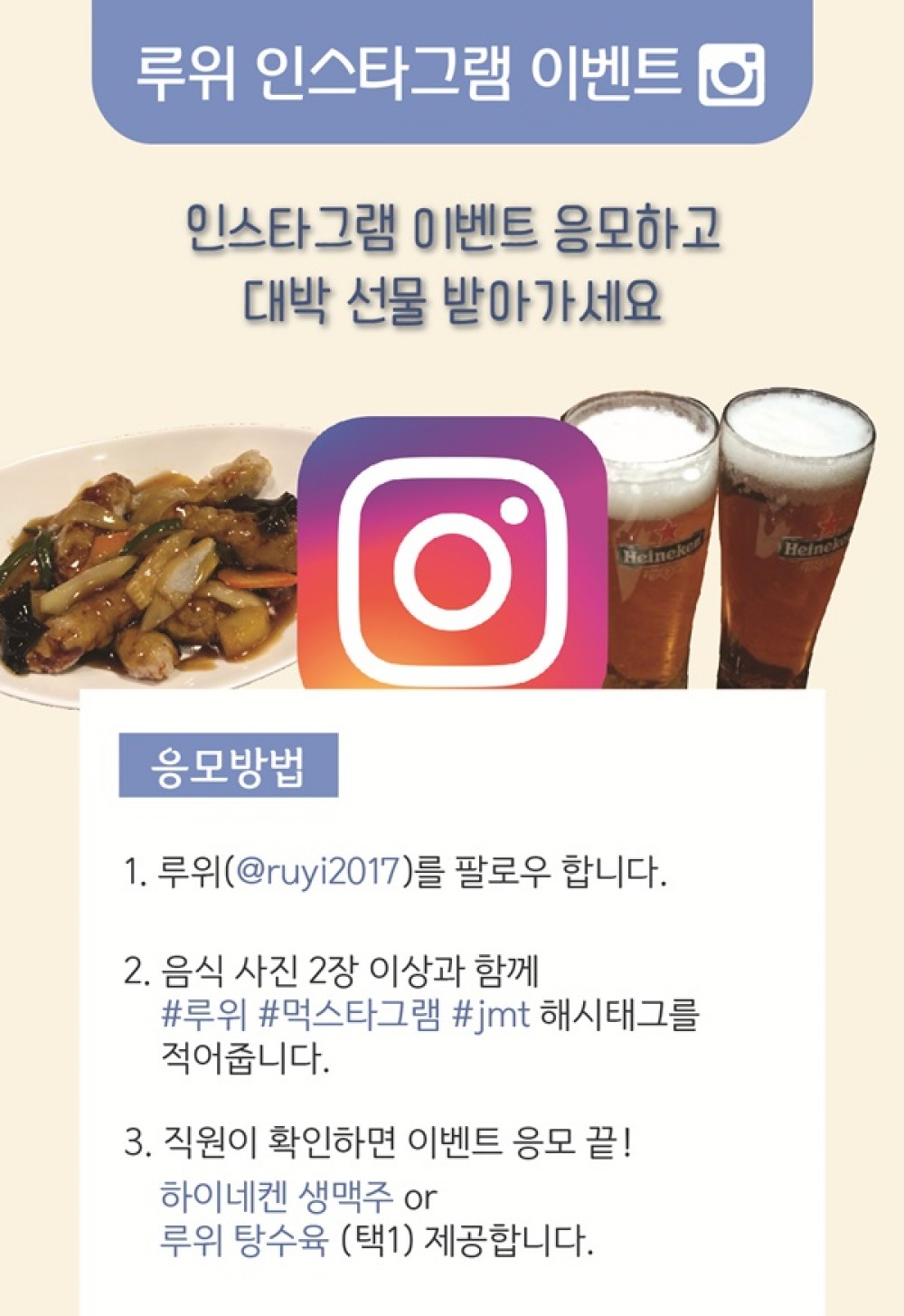 <루위 인스타그램 대박 이벤트> 루위 매장에서 식사하고 음식 사진을 인스타그램에 업로드하면 대박혜택을 드립니다.자세한 이벤트 내용은 이미지를 참고해주세요~ <위 이벤트는 루위 매장에서 메뉴를 …
