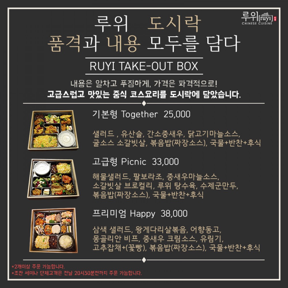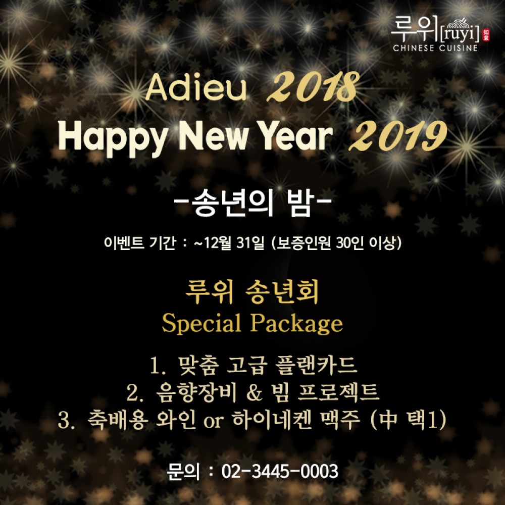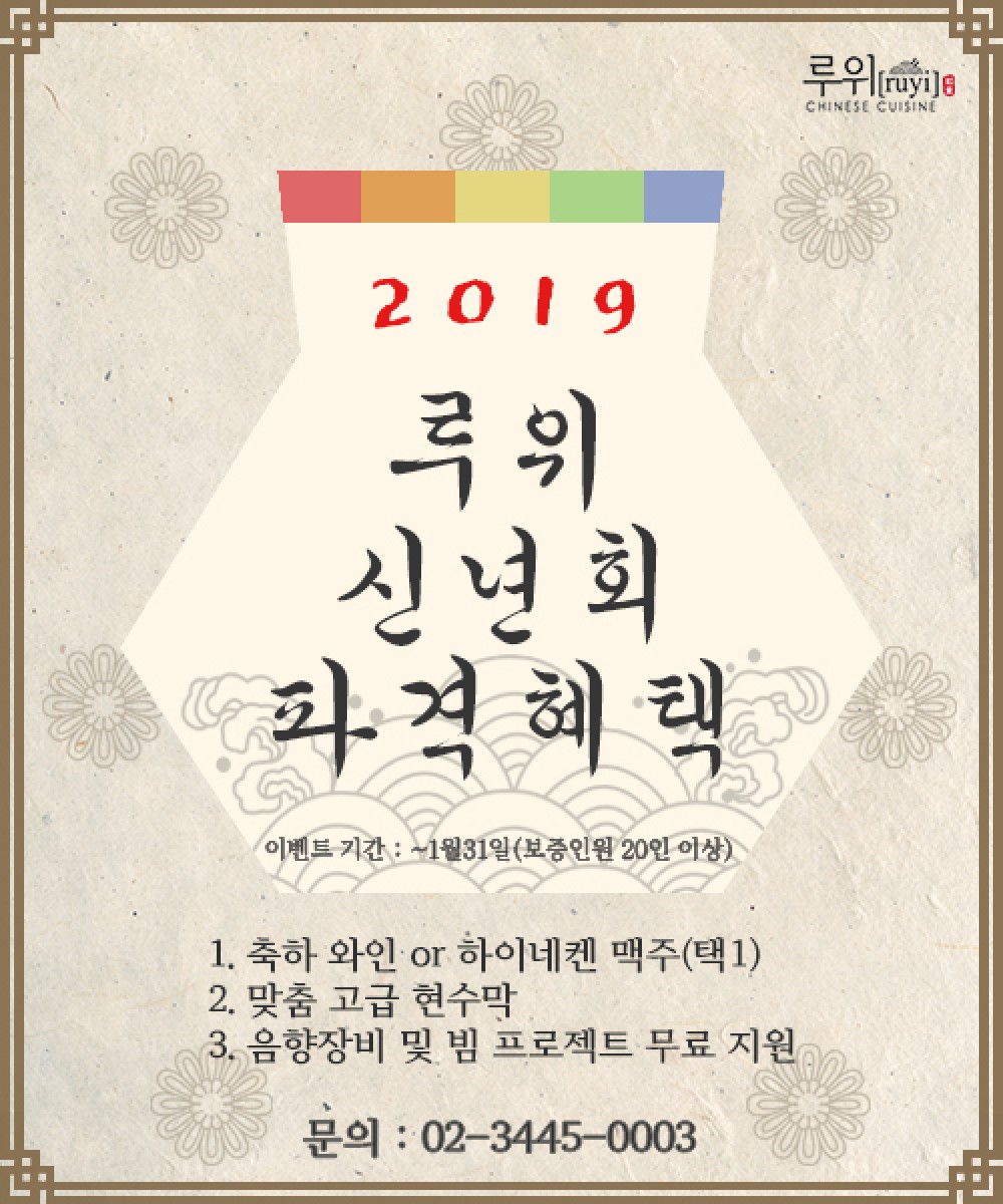[루위 2018 송년회 특별 프로모션]프리미엄 중식 레스토랑 루위에서는 2018 가는 해를 보내고, 2019 오는 해를 뜻깊게 맞이하시라고 [송년회 특별 프로모션]을 진행합니다.프로모션 기간인 12월 31일까지 사전 예약을 하시면 아래 3가지 특별 혜택을 받으…