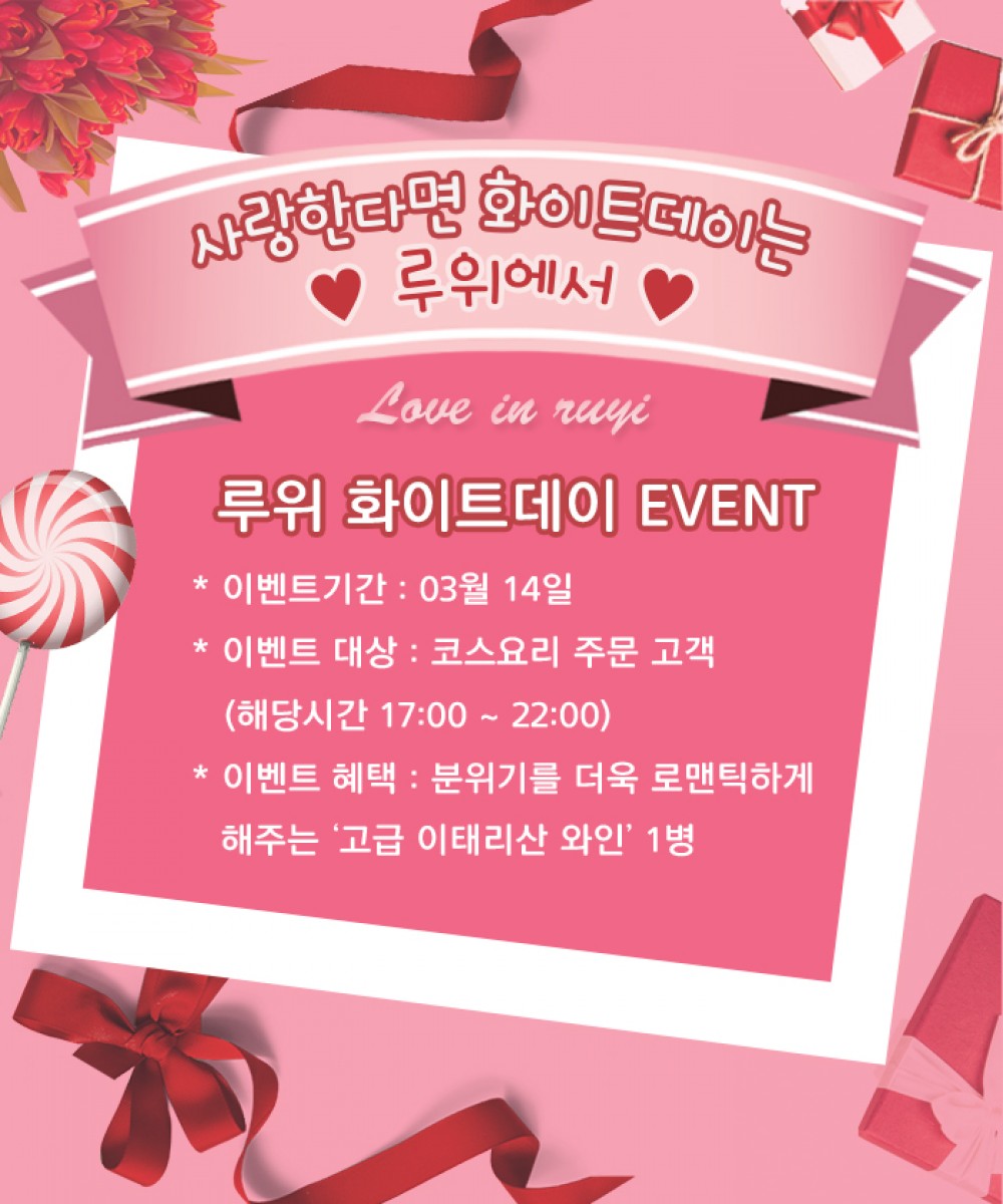 사랑한다면 화이트데이는 루위에서!루위 화이트데이 대박 이벤트 화이트데이는 루위와 함께하세요.고급 이태리 와인1병이 사랑하는 사람과의데이트를 더욱 분위기 있게 해줍니다.자세한 내용은 이벤트 이미지를 참고해주세요~